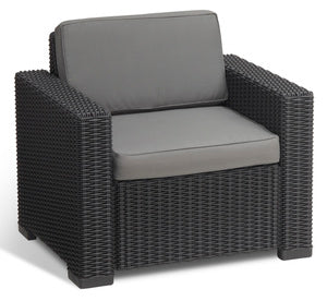 poltrona cm 83x68x72h in resina antiurto effetto polirattan.Completo di cuscini (spessore seduta 7,5 cm - spessore schienale 12 cm)