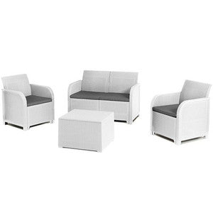 in resina antiurto effetto polirattan. Completo di cuscini spessore 4 cm Composto da: divano cm 113x65x74h, due poltrone cm 65x63x74h, tavolino cm 60x55x39h. Imballo in cartone unico cm 120x64x60h - Peso 36 kg.