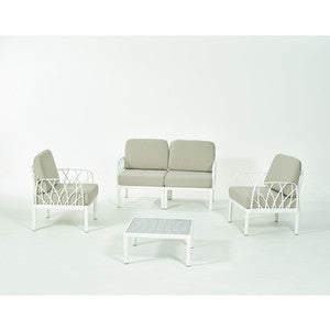 struttura in polipropilene rinforzato in fiblerglass. Antistatico, resistente ai raggi UV. Composta da: 1 divano 2 posti cm 140x75x78h2 poltrone cm 71,5x75x78h1 tavolino cm 75x62,5x37h