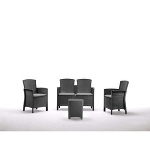 - Salottino da esterno con design in rattan colore grafite, composto da 2 poltrone, 1 sofa 2 posti e tavolino contenitore. Cuscini inclusi. Set da Giardino prodotto in plastica waterproof, facile da pulire. Elemento d'arredo ideale per uso all'esterno in giardino o al chiuso
