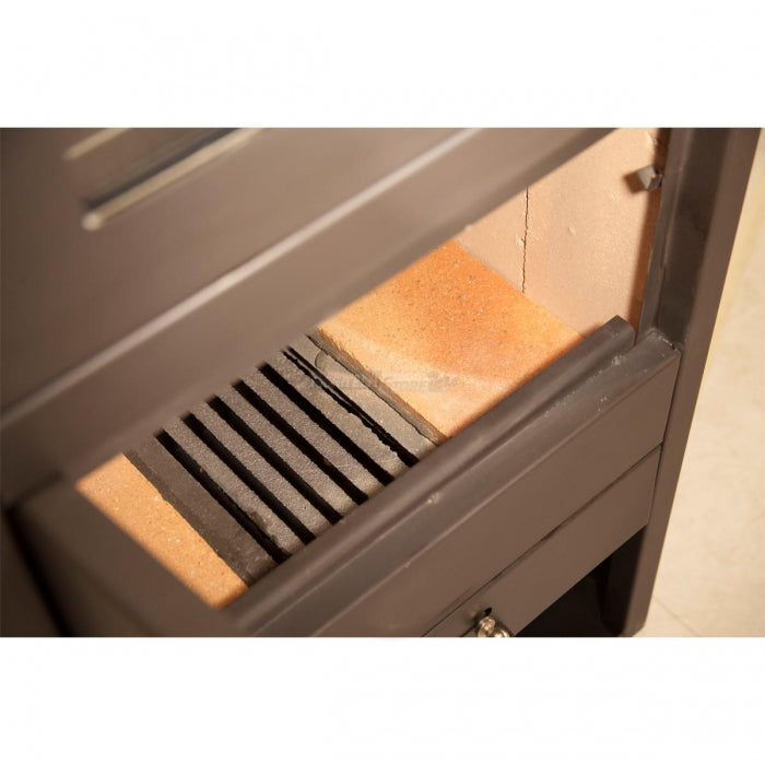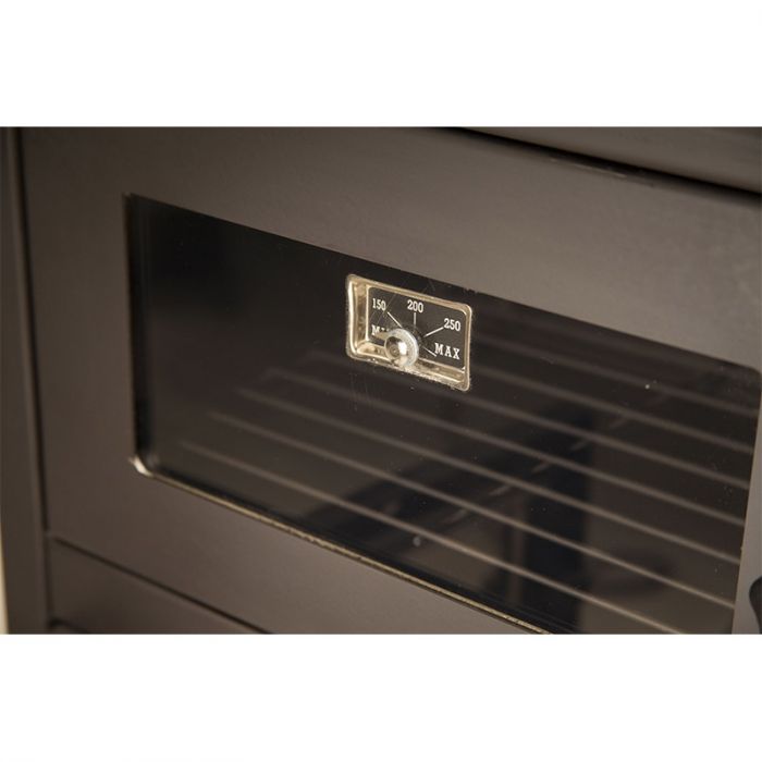 Struttura in acciaio ad alto spessore. Forno verniciato, munito di termometro. Cassetto portacenere estraibile. Vano portalegna. Potenza termica 12,0 kW. Volume riscaldabile 140 m³. Scarico fumi ø 12 cm. Maniglia con inserti anti-scottatura. Dimensioni forno 43 x 31 x h 23 cm. Colore nero. Dimensioni 51 x 48 x h 106 cm. Peso 94 kg.